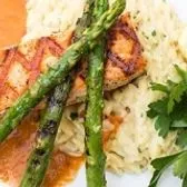 Grilled salmon, Mediterranean couscous, asparagus